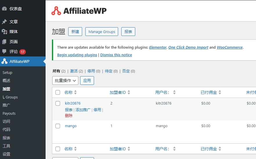 注意:AffiliateWP v2.16.3已亲测。安装启用,输入任意字符串激活使用。